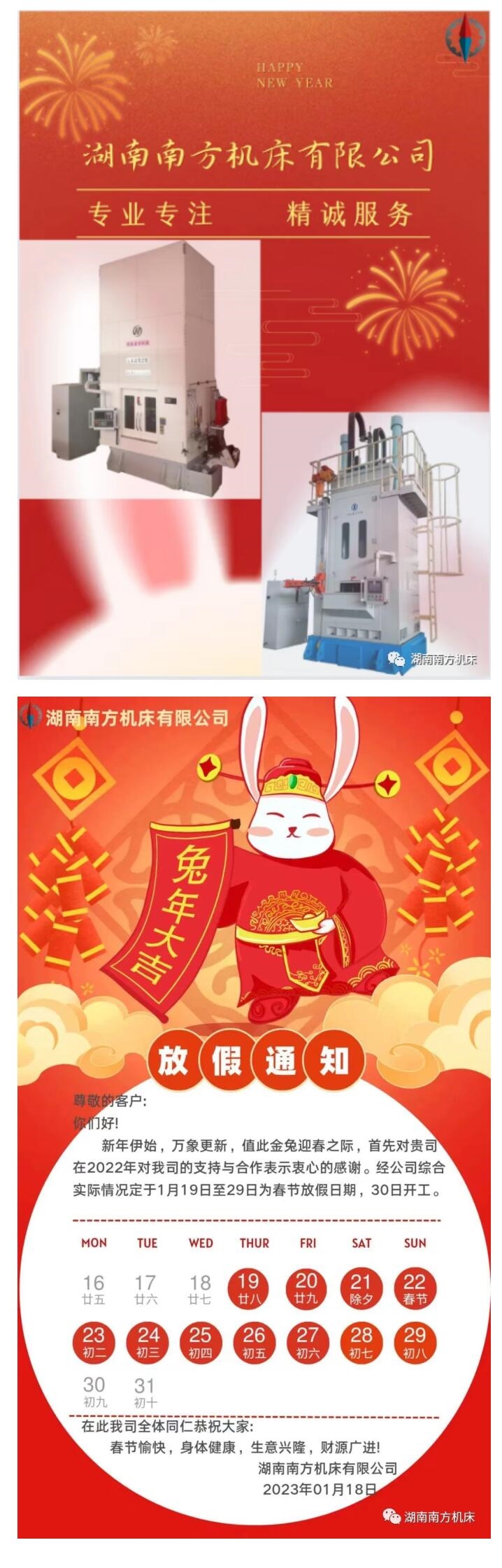 當前(qián)位置:首(shǒu)頁 > 新聞(wen)中心 > 湖(hu)南南方(fāng)機床有(yǒu)限公司(sī)2023年春節(jiē)放假通(tong)知!